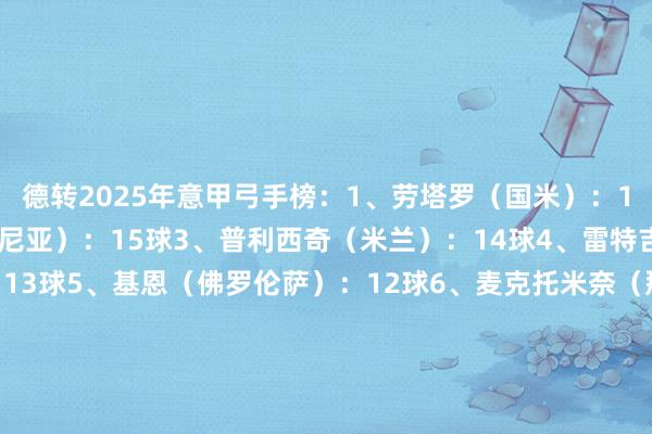 德转列2025年意甲弓手榜,劳塔罗与奥尔索里尼15球比肩第一。 德转2025年意甲弓手榜: 1、劳塔罗(国米):15球 奥尔索里尼(博洛尼亚):15球 3、普利西奇(米兰):14球 4、雷特吉(亚特兰大):13球 5、基恩(佛罗伦萨):12球 6、麦克托米奈(那不勒斯):11球 7、莱奥(米兰):10球 伊尔迪兹(尤文):10球 9、多夫比克(罗马):9球 克尔斯托维奇(亚特兰大/莱切):9球 苏莱(罗马):9球 帕斯(科莫):9球 弗拉西奇(齐灵):9球 曼德拉戈拉(佛罗伦萨):9球