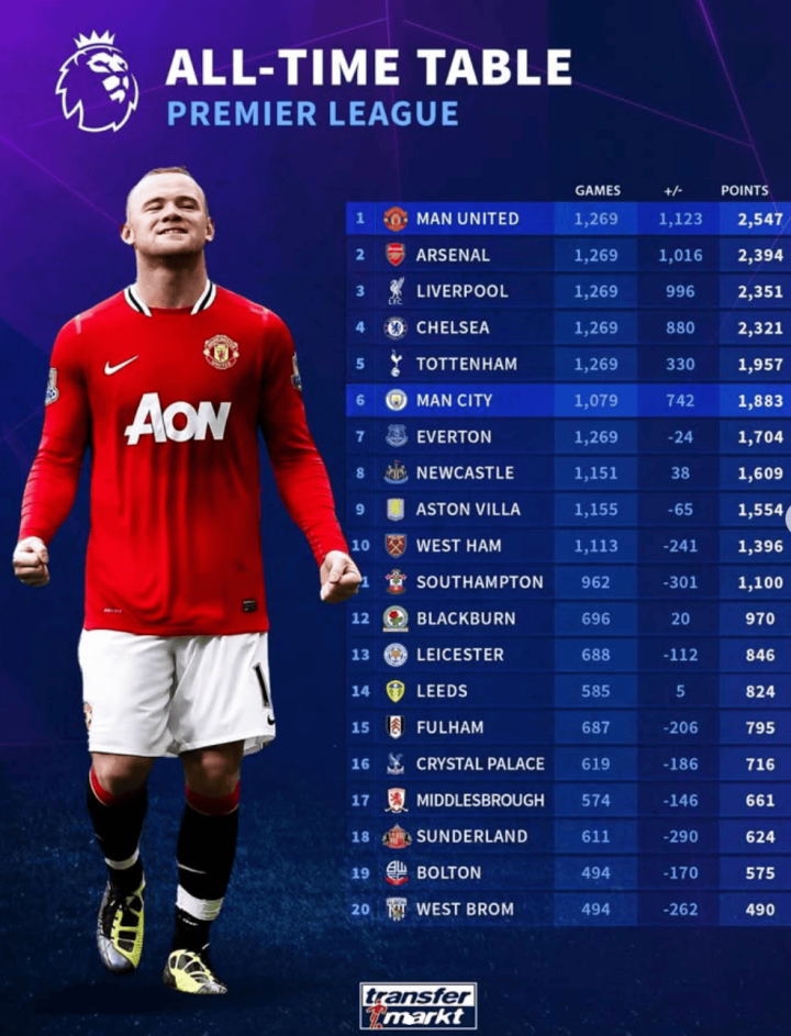 虎扑09月14日讯德转统计了自英超(自1992/93赛季以来)开拓以来各队累计比赛场次、总净胜球和总积分榜单。
