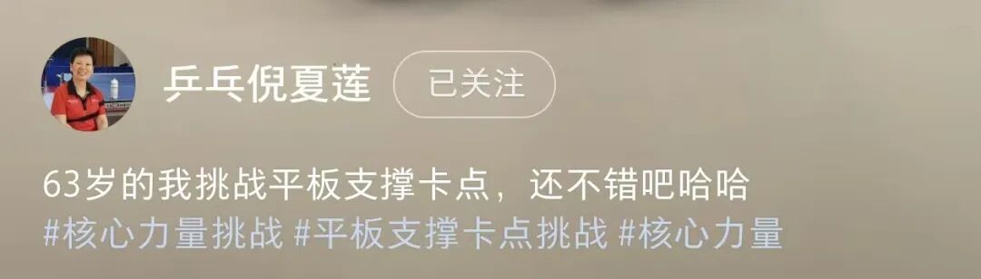 她配文称:“63岁的我,挑战平板撑抓卡点,还可以吧!哈哈!”同期,她还带上了“中枢力量挑战”的话题词。