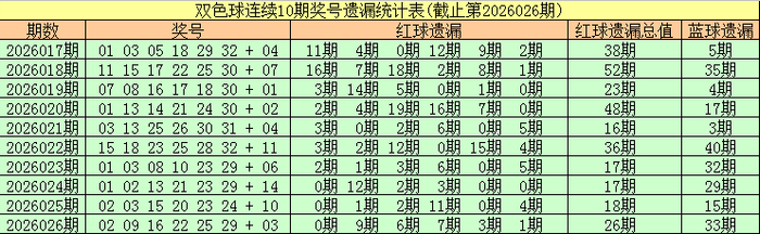 适度双色球第2026026期,最近10期红球遗漏总值分手为:38期、52期、23期、48期、16期、36期、17期、17期、18期、26期,上期遗漏总期数偏高。