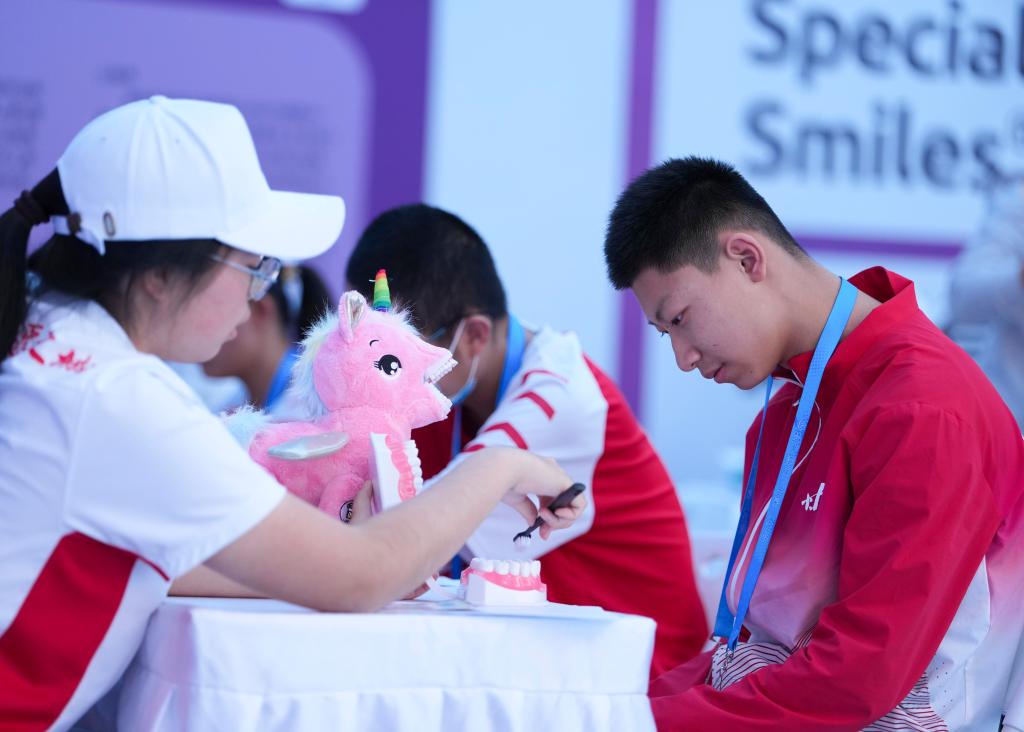 12月8日,在广东省中山市体育馆副馆,责任主说念主员为特奥畅通员进步护齿常识。新华社记者 杨朝阳 摄