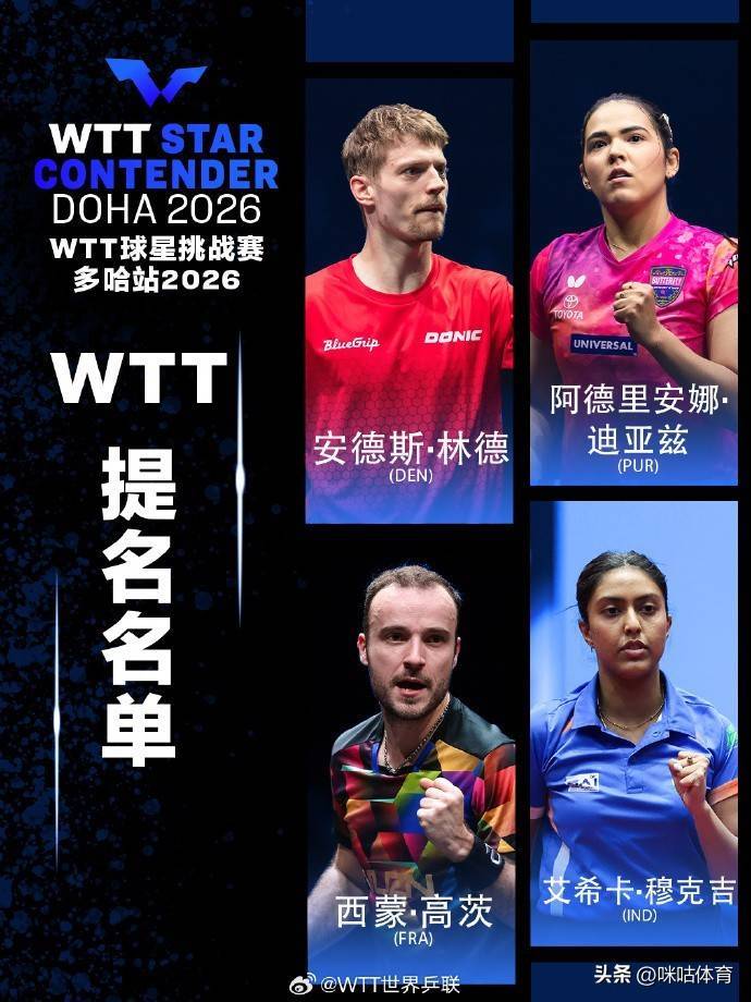 WTT提名名单:林德、迪亚兹、西蒙·高茨、穆克吉